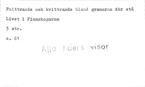 //// Fnittrande och kvittrande bland granarna där stå Livet i Finnskogarna //// 3 str. //// s. 61 //// tiders visor ////