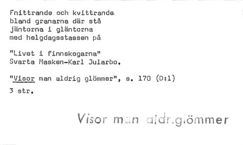 //// Fnittrande och kvittranda bland granarna där stå jäntorna i gläntorna //// med helgdagsstassen på //// "Livet i finnskogarna" Svarta Masken-Karl Jularb0. //// "Visor man aldrig glömmer", s. 170 (D:1) 3 str. //// Visor ri-Ln u-Ä:dr.görnmer ////