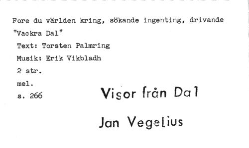 //// Fore du världen kring, sökande ingenting, drivande "Vackra Dal" //// Text: Torsten Palmring //// Musik: Erik Vikbladh //// 2 str. //// mel. //// s. 266 Visor från Dal //// Jan Vegedius ////