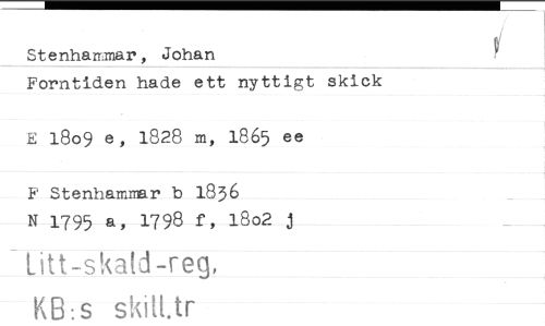 //// Stenhammar, Johan //// Forntiden hade ett nyttigt skick //// E 18o9 e, 1828 m, 1865 ee //// F Stenhammar b 1836 //// N 1795 a, 1798 f, 18o2 j //// Litt-skat3-reg, //// KB:s skitt tr ////