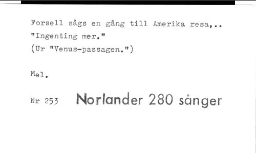 //// Forsell sågs en gång till Amerika resa,.. "Ingenting mer." //// (Ur "Venus—passagen.") //// Mel. //// Nr 253 Norlander 280 sånger ////
