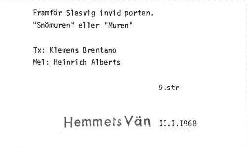 //// Framför Slesvig invid porten. "Snömuren" eller "Muren" //// Tx: Klemens Brentano Mel: Heinrich Alberts //// 9.str //// Hemmets Vän ILI.1968 ////