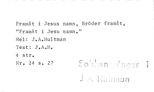 //// Framåt i Jesus namn, Bröder framåt, "Framåt i Jesu namn." //// J.A.Hultman //// Text: J.A.H. //// 4 str. //// Nr. 24 s. 27 rt ////