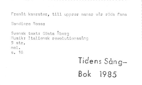 //// Framåt kamrater, till uppror manar vår röda fana Sandiera Rossa //// Svensk text: Gösta Aberg //// Musik: Italiensk revolutionssång 5 str. //// mel. //// s. 18 //// Tidens Sång— //// Bok 1985 ////