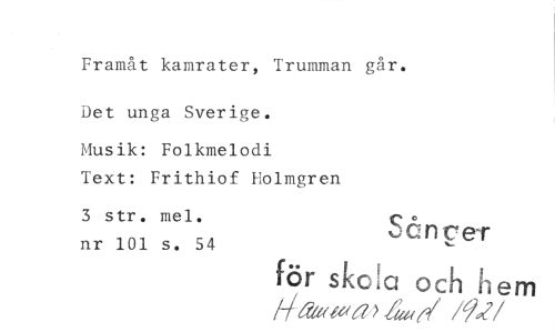 //// Framåt kamrater, Trumman går. Det unga Sverige. //// Musik: Folkmelodi //// Text: Frithiof Eolmgren //// 3 str. mel. nr 101 s. 54 Sån per //// för skola och hem /-igieueea.ba,(2/ /92 //// /