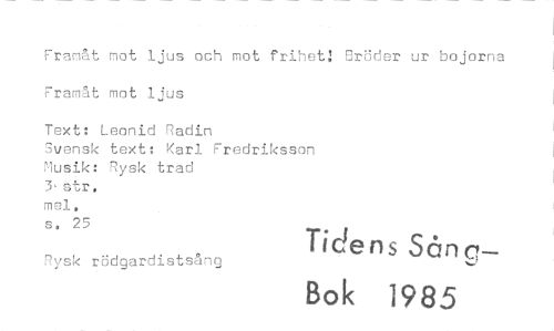 //// Framåt not ljus och mot frihet: Bröder ur bojarna Framåt mot ljus //// Text: Leonid Radin //// Svensk text: Karl Fredriksson Musik: Rysk trad //// 3,str. //// mei. //// s. 25 //// Tidens San r_:— //// Rysk rödgardistsång //// Bok 1985 ////