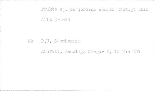 //// Frukta ej, //// Allt är nåd //// om jordens soumar -Hastigt blir //// rk P.U. StenhauLar //// hnfolt, Andeliga Sånger T. 12 N: o 187 ////
