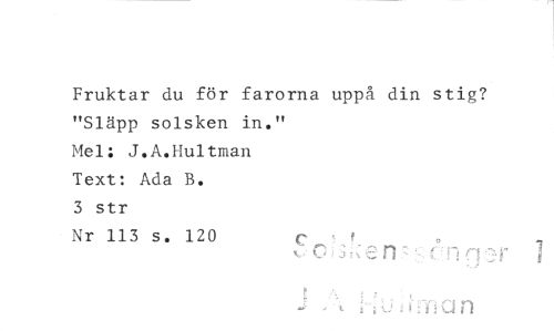 //// Fruktar du för farorna uppå din stig? //// "Släpp solsken in. Mei: J.A.Hultman Text: Åda B. It C0 //// 3 str C e n 7, 7 //// Nr 113 s. 120 //// # cl n ////