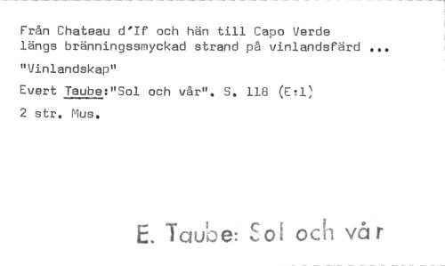 //// Från Chateau d'If och hän till Capo Verde längs bränningssmyckad strand på vinlandsfärd //// "Vinlandskap" //// Evert Taube:"Sol och vår". S. 118 (Et1 2 str. Mus. //// E. Taube: ,fr)i och vår ////