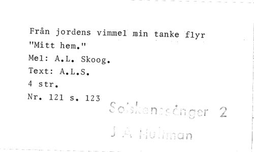 //// Från jordens vimmel min tanke flyr "Mitt hem." //// Mel: A.L. Skoog. //// Text: A.L.S. //// 4 str. //// Nr. 121 s. 123 ////