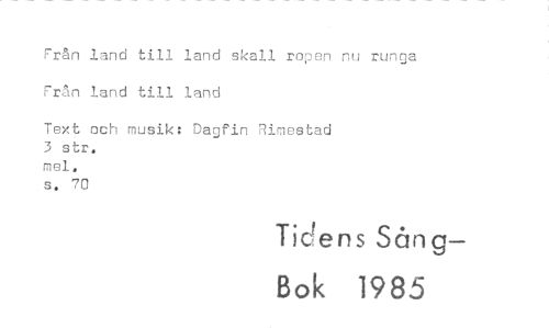 //// Från land till land skall ropen nu runga Från land till land //// Text och musik: Dagfin Rimestad 3 str. //// mel, //// s. 70 //// Tidens Sång— //// Bok 1985 ////