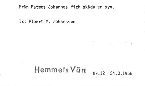 //// Från Patmos Johannes fick skåda en syn. //// Tx: Albert M. Johansson //// Hemmets Vän Nr.12 24.3.1966 ////