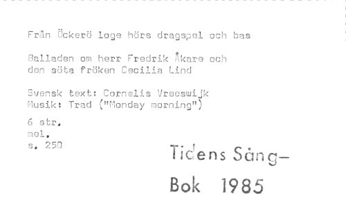 //// Från äckerö loge hörs dragspel och bas //// Balladen om herr Fredrik idkare och den söta fröken Cecilia Lind //// Svensk text: Cornelis Vreeswijk Musik: Trad ("Monday morning") //// 6 str. mol. //// s. 250 //// Tic'ens Sån //// Bok 1985 ////