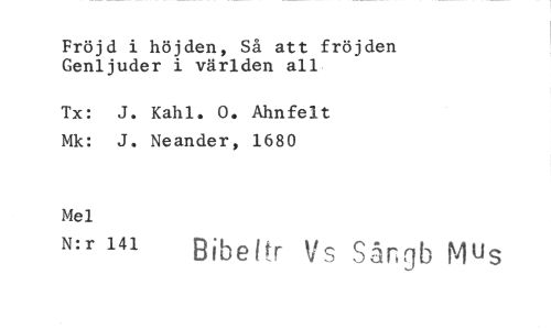 //// Fröjd i höjden, Så att fröjden Genljuder i världen all //// Tx: J. Kahl. 0, Ahnfelt Mk: J. Neander, 1680 //// Mel //// N:r 141 Bibel r Vs Sångb Mus ////