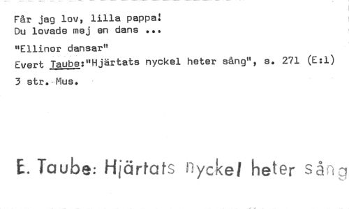 //// Får jag lov, lilla pappas //// Du lovade mej en dans ... //// "Ellinor dansar" //// Evert Taube:"Hjärtats nyckel heter sång", s. 271 (E:1) 3 str.,Mus. //// E. Taube: Hjärtats nyckel heter så'-;1 ////