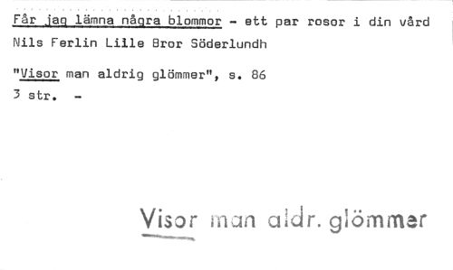 //// Får jag lämna några blommor - ett par rosor i din vård Nils Ferlin Lille eror Söderlundh //// "Visor man aldrig glömmer", s. 86 3 str. //// Visor man a dr. glömmer ////
