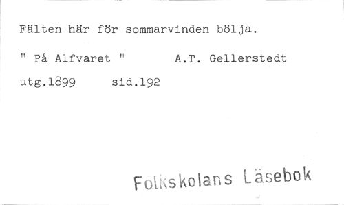 //// Fälten här för sommarvinden bölja. //// " På Alfvaret " A.T. Gellerstedt //// utg.1899 sid.192 //// F 'iAkolans Läsebok ////