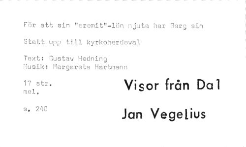 //// För att sin "eremit"-lön njuta har Berg sin Statt upp till kyrkoherdeval //// Text: Gustav Hedning Musik: Margareta Hartmann //// 17 str. mel. Visor från Dal //// s. 240 Jan Vegelius ////