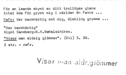 //// För en leende skymt av ditt trollögas glans Intet öde för grymt mig i världen än fanns ... //// Refr: Var barmhärtig mot mig, älskling grymma ... //// "Var barmhärtig" //// Algot Sandberg-N.R.Bakaleinikov. //// "Visor man aldrig glömmer". (D:1) S. 28. 2 str. + refr. //// Visor ihan uidr.giörnmer ////