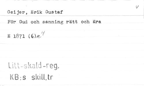 //// Geijer, Erik Gustaf //// För Gud och sanning rätt och ära //// E 1871 (‘)4!- //// Utt -stt tå -reg, //// KB; S skitLtr //// V ////