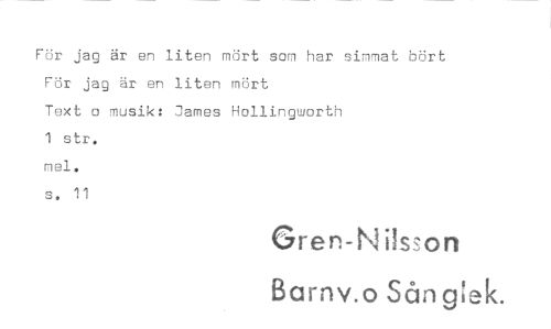 //// För jag är en liten mört som har simmat hört För jag är en liten mört //// Text o musik: James Hollingworth //// 1 str. //// mel. //// s. 11 //// Gren-N ilson //// Barnv.o Sån gisek. ////