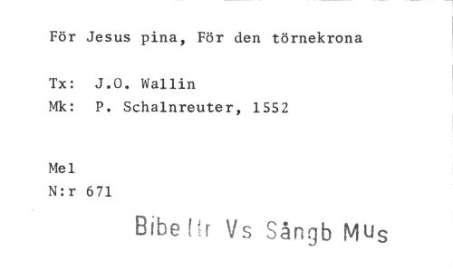 //// För Jesus pina, För den törnekrona //// Tx: J.O. Wallin //// Mk: P. Schalnreuter, 1552 //// Mel //// N:r 671 //// Bibe rir Vs Sångb Mus ////