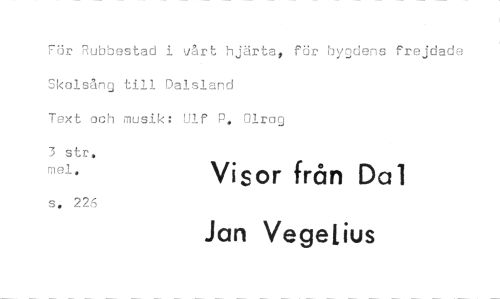 //// För Rubbestad i vårt hjärta, för bygdens frejdade Skolsång till Dalsland //// Text och musik: Ulf P. Olrog //// 3 str. //// mal. Visor från Dal //// s. 226 //// Jan Vegetius ////