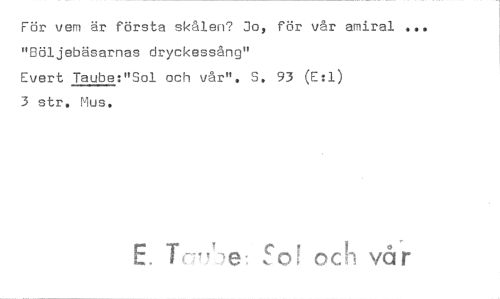 //// För vem är första skålen? Jo, för vår amiral "Böljebäsarnas dryckessång" //// Evert Taube:"Sol och vår". S. 93 (E:1) 3 str, Mus. //// och vår ////