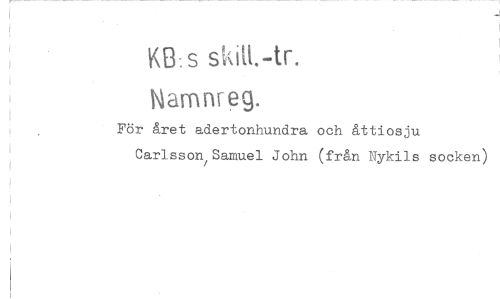 //// KBs skilt.-tr. //// Namnreg. //// För året adertonhundra och åttiosju Carlsson Samuel John (från Nykils socken) ////