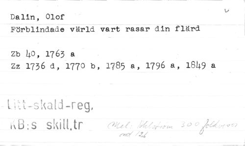 //// Dalin, Olof //// Förblindade värld vart rasar din flärd //// Zb 40, 1763 a //// Z2 1736 d, 1770 b, 1785 a, 1796 a, 18L.9 a //// fti-stcaH-reg, //// i EI:s ////