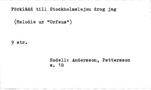 //// Förklädd till Stockholmslejon drog jag (Melodis ur "Orfeus") //// 9 str. //// Hodell: Andersson, Pettersson s. 10 ////