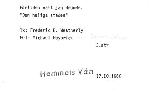 //// Förliden natt jag drömde. "Den heliga staden" //// Tx: Frederic E. Weatherly //// Mel: Michael Maybrick //// 3.str //// Hemmets 17.10.1968 ////