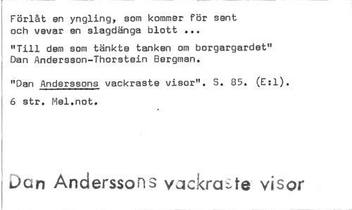 //// Förlåt en yngling, som kommer för sent och vevar en slagdänga blott ... //// "Till dem som tänkte tanken om borgargardet" Dan Andersson-Thorstein Bergman. //// "Dan Anderssons vackraste visor". S. 85. (E:1). 6 str. Mel.not. //// Dan Anderssons vackra te visor ////