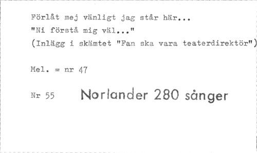 //// Förlåt mej vänligt jag står här... //// "Ni förstå mig väl..." //// (Inlägg i skämtet "Fan ska vara teaterdirektör") //// Mel. = nr 47 //// Nr 55 Norlander 280 sånger ////