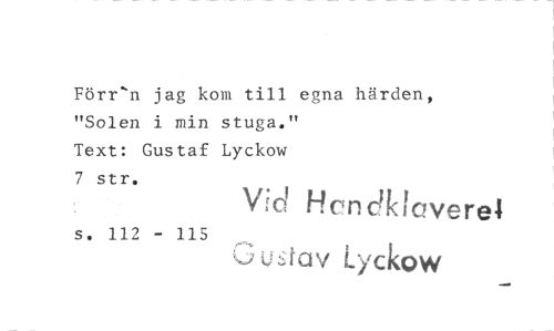 //// Förr'n jag kom till egna härden, "Solen i min stuga." //// Text: Gustaf Lyckow //// 7 str. //// Vid Hendidaverei //// s. 112 - 115 //// •:,;1,_iav i YCkOW ////