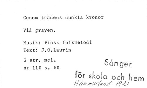 //// Genom trädens dunkla kronor Vid graven. //// Musik: Finsk folkmelodi Text: J.O.Laurin //// 3 str. mel. nr 110 s. 60 Sånger //// för skotia ocn hem gap, p2arbfAi7 ////