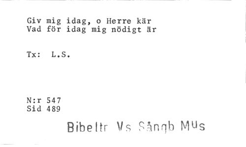 //// Giv mig idag, o Herre kär Vad för idag mig nödigt är //// Tx: L.S. //// N:r 547 //// Sid 489 //// Bibeltr Nis Nnqh Mus ////