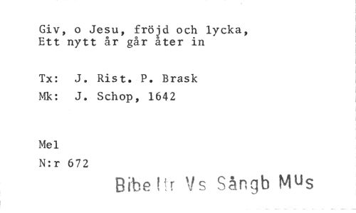 //// Giv, o Jesu, fröjd och lycka, Ett nytt år går åter in //// Tx: J. Rist. P. Brask Mk: J. Schop, 1642 //// Mel //// N:r 672 //// Bi-be Sångb Mus ////