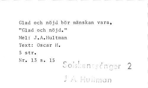 //// Glad och nöjd bör mänskan vara, "Glad och nöjd." //// Mel: J.A.Hultman Text: Oscar H. //// 5 str. //// Nr. 13 s. 15 ////
