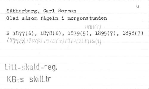 //// Sätherberg, Carl Herman //// Glad såsom fågeln i morgonstunden //// E 1877(6), 1878(6), i9/L-i 71 1879(5), 1895(7), 1898(7) //// /3,5‹196064 I '''''11420} //// titt-skald-reg, //// KB: s ////