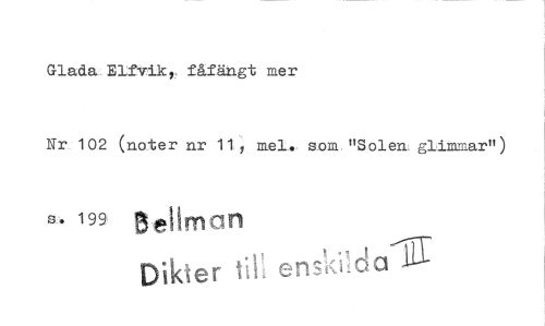 //// Glada. Elfvik, fåfängt mer //// Nr. 102 (noter nr 111 inel. som "Solen glintLar") //// as 199 Bei man //// Dikter tir, enstf,i. ////