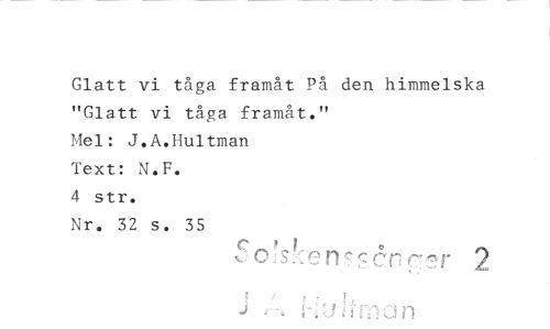 //// Glatt vi tåga framåt På den himmelska "Glatt vi tåga framåt." //// Mel: J.A.Hultman //// Text: N.P. //// 4 str. //// Nr. 32 s. 35 //// 5 o n c° n (.7. er //// j .,- //// 1...J ////