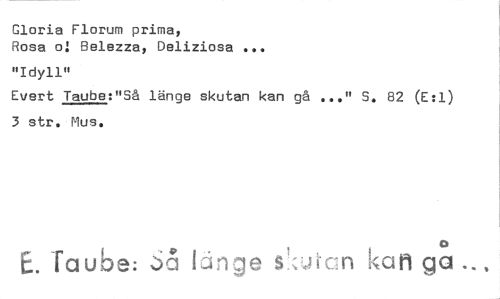 //// Gloria Florum prima, //// Rosa p! Belezza, Deliziosa //// "Idyll" //// Evert Taube:"Så länge skutan kan gå ..." S. 82 (E:1) 3 str. Mus. //// E. Taube: ja länge sbta p //// n kan ga ////
