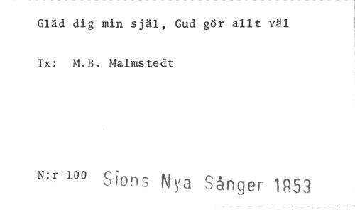 //// Gläd dig min själ, Gud gör allt väl //// Tx: M.B. Malmstedt //// N:r 100 Sions Nya Sånger 1853 ////