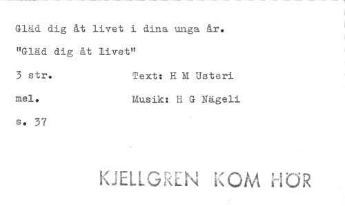 //// Gläd dig åt livet i dina unga år. "Gläd dig åt livet" //// 3 str. Text: H M Usteri //// mel. Musik: H G Nägeli //// s. 37 //// KJELLGREN OM 'FOR ////