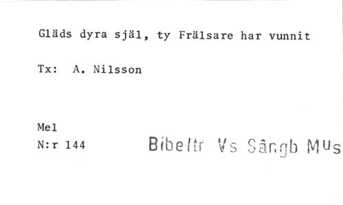 //// Gläds dyra själ, ty Frälsare har vunnit Tx: A. Nilsson //// Mel //// N:r 144 Bibe(tr Vs Sår,gb Mus ////