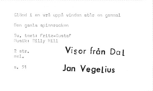//// Glömd i en vrå uppå vinden står en gammal Den gamla spinnrocken //// Sv. text: Fritz-Gustaf Musik: Billy Hill //// 2 str. Visor från Dat //// mel. //// s. 51 Jan Vegelius ////