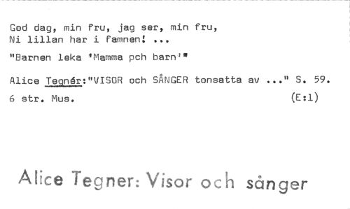 //// God dag, min fru, jag ser, min fru, Ni lillan har i famnen! //// "Barnen leka 'Mamma pch barn" //// Alice Tecinår:"VISOR och SÅNGER tonsatta av ..." S. 59. 6 str. Mus. (E:1) //// Alice Teg ner: Visor och sånger ////