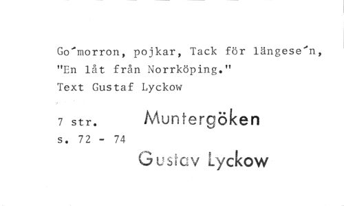 //// Go'morron, pojkar, Tack för längese'n, "En låt från Norrköping." //// Text Gustaf Lyckow //// 7 str. Muntergöken //// s. 72 - 74 //// Geskiv Lyckow ////