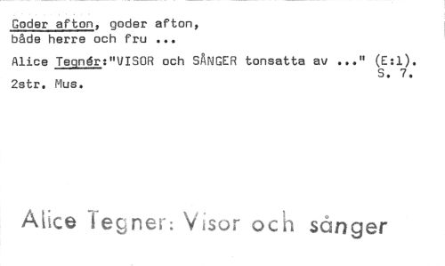 //// Goder afton, goder afton, både herre och fru ... av •••" (E:1). //// Alice Tegnår:"VISOR och SANGER tonsatta 2str. Mus. S. 7. //// ALice Tegner: Visor och sånger ////